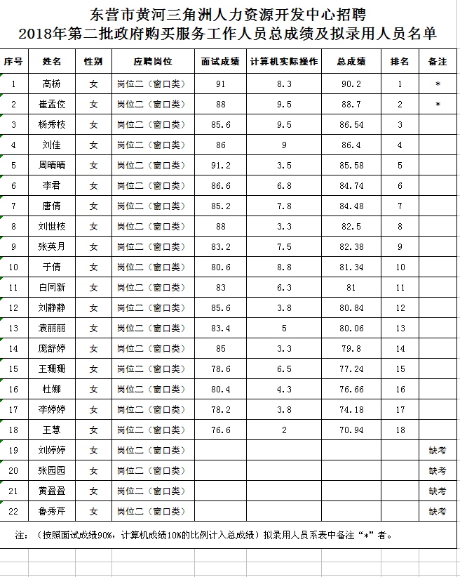 根據(jù)本次招聘活動(dòng)的安排,現(xiàn)將東營(yíng)市黃河三角洲人力資源開發(fā)中心招聘2018年第二批政府購買服務(wù)工作人員的總成績(jī)及擬錄用人員名單予以公布。望擬錄用人員按照統(tǒng)一規(guī)定和要求辦理相關(guān)手續(xù)。